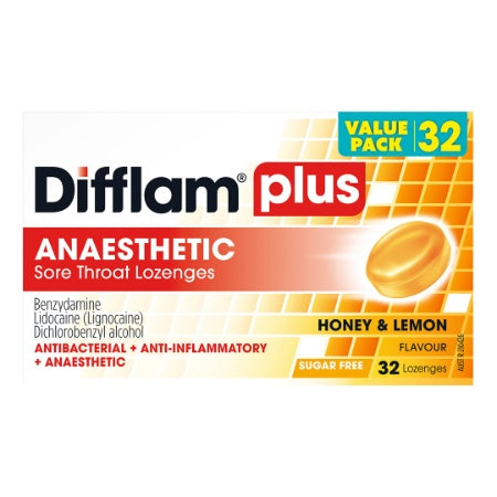 Difflam Plus Anaesthetic Sore Throat Lozenges Honey & Lemon Flavour 32 Pack