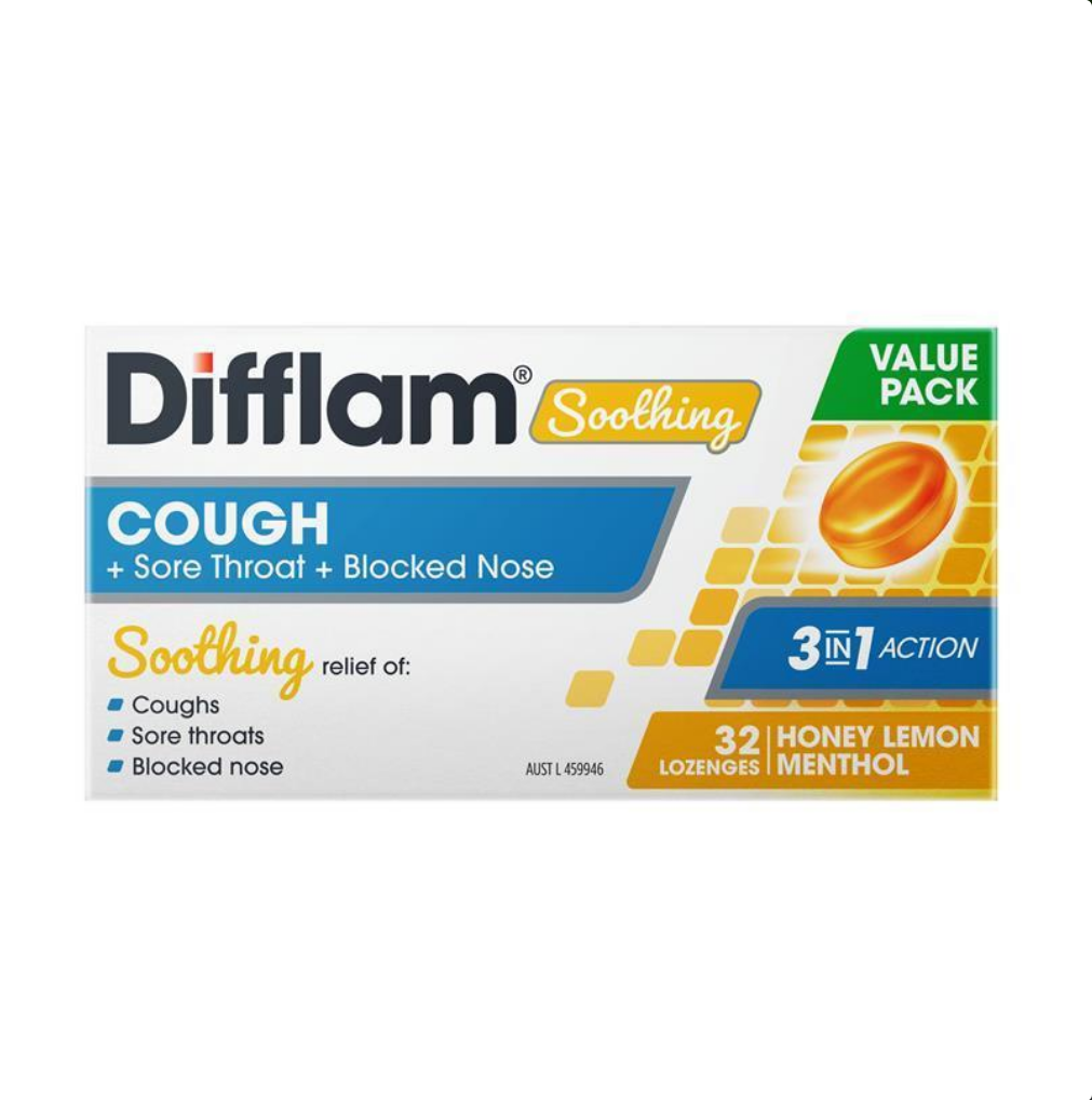 Difflam Soothing Cough + Sore Throat + Blocked Nose Honey Lemon 32 Lozenges