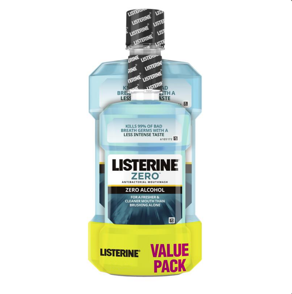 Listerine Zero Alcohol Antibacterial Mouthwash Less Intense Taste 1 Litre + 250mL Value Pack
