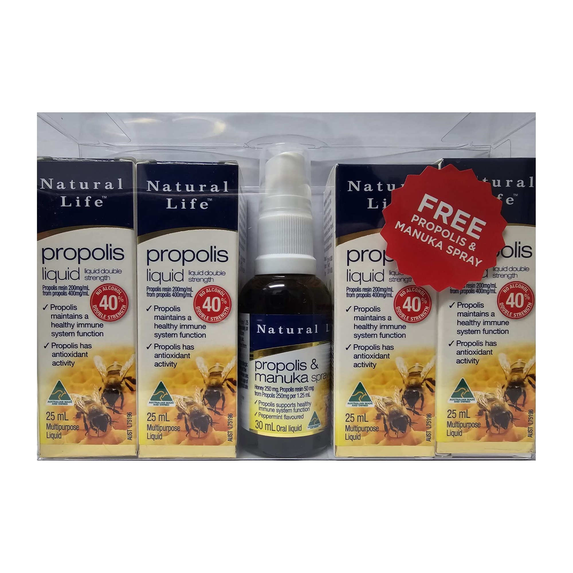 Natural Life Propolis & Manuka Honey Liquid Pack - 4 x 25mL + FREE Oral Liquid Spray 30mL