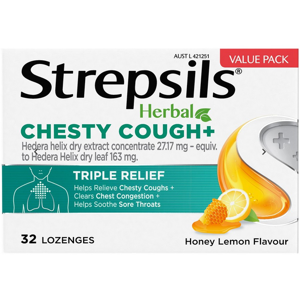 Strepsils Herbal Chesty Cough+ Triple Relief Lozenges Honey Lemon 32 Pack