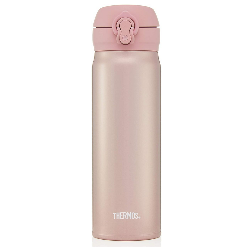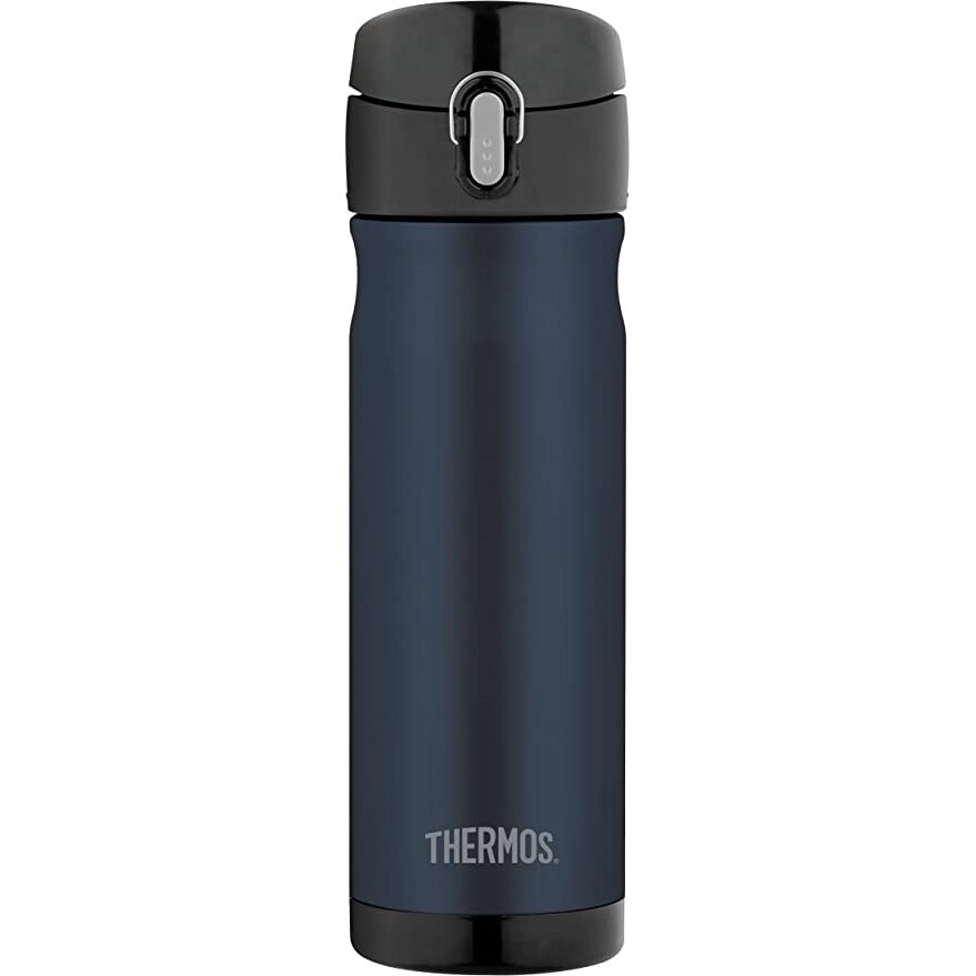 Thermos vacuum insulation technology locks in temperature to preserve flavour and freshness, keeps hot up 12 hours or cold up to 24 hours. Durable 18/8 stainless steel interior and exterior withstand the demands of everyday use. Drink lid opens with push button ease and locks closed. Light and compact design for effortless transport and storage. Bottle stays cool to the touch with hot liquids and is condensation-free with cold. Contoured body is comfortable to hold and fits most vehicle cup holders. Capacity: 470ml.